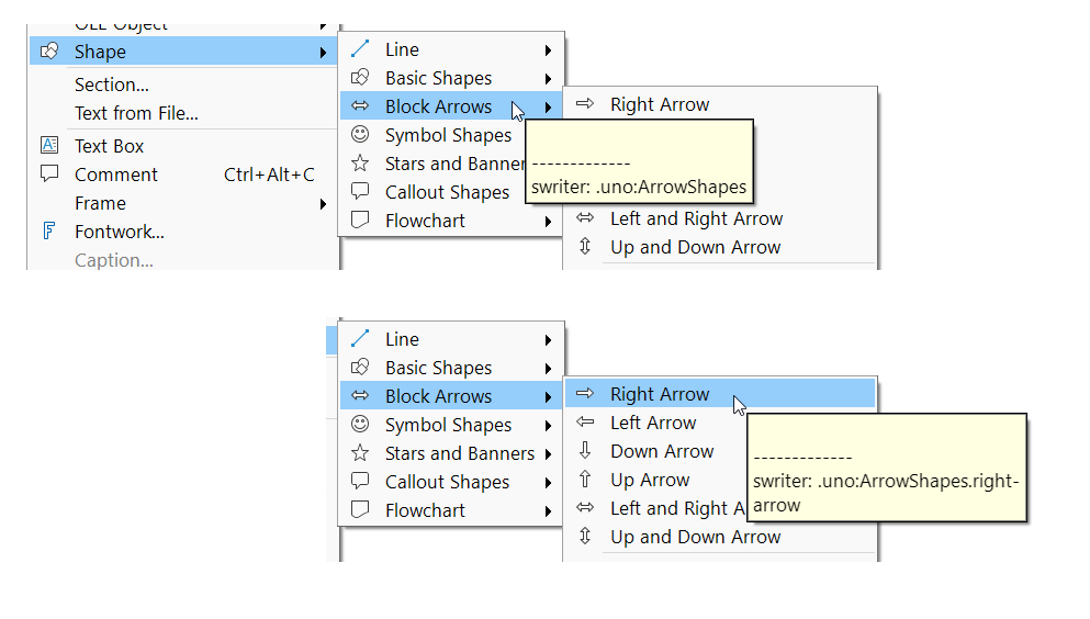 dispatcher.executeDispatch(document, ".uno:ArrowShapes", "", 0, Array())