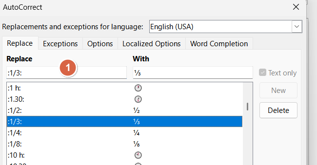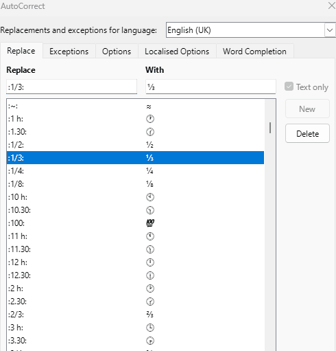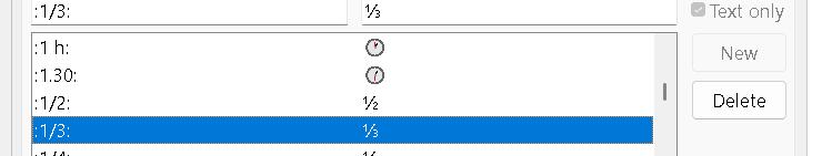 For some unknown reason when I select 1/3 in Replace the superscript / subscript 1/3 in Wth column. The New button stays grayed out. Even though it is highlighted as your example shows. My version of writer will not allow me to type 1/3 using superscript / subscript in the With column. Nor can I highlight it copy and paste to the With column and choose New. New stays grayed out.
