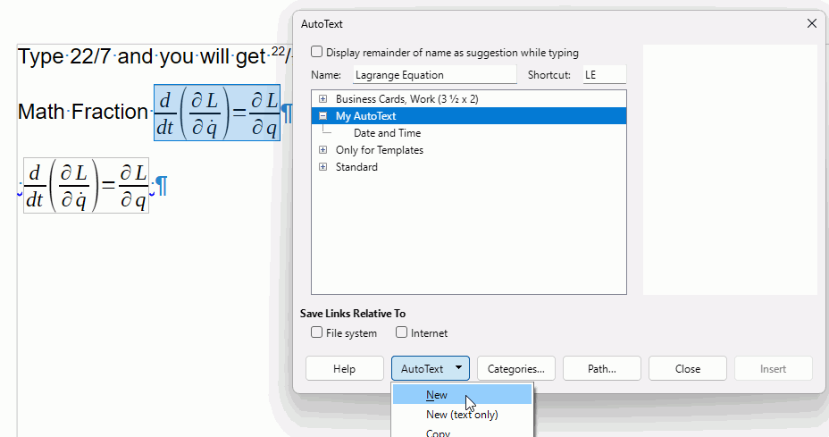 - In the dialogue select My AutoText then enter a name, e.g. Lagrange Equation, the Shortcut will automatically fill in the initials LE but you can change that.