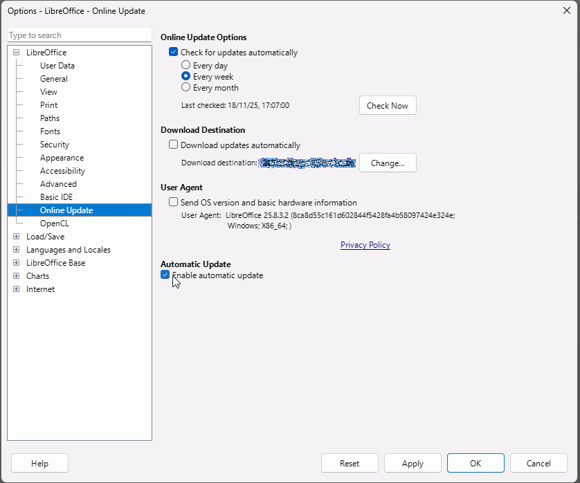 I can’t find an option in LibreOffice to disable this. There are some online search references referring to the options window under ‘Libre Office’ for ‘Automatic Updates’ but I guess that was for older versions because it isn’t there now.