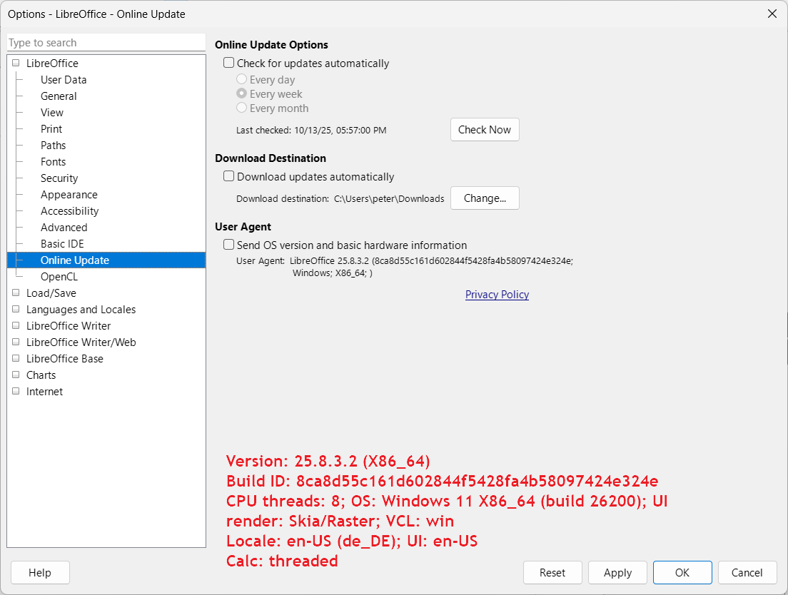 I just installed LibreOffice_25.8.3.2_Win_x86-64 on a brand new Windows 10 Pro setup. I unchecked the automatic updates as usual. When I started LO, the first thing it did was try to connect to the update server.