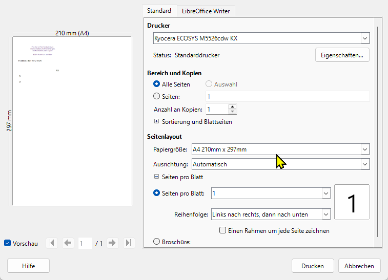 Kann auch sein, dass das Zusammenspiel von DruckerGUI und Druckdialog von LibreOffice nicht so recht klappt. Ist bei mir unter Linux ja deutlich einfacher aufgebaut. Mich irritiert, dass Du beim Dialog des Kyocera das Druckformat auf A4 stehen hast. Es kann ja sein, dass diese Druckereinstellung grundsätzlich bei Dir durchschlägt.