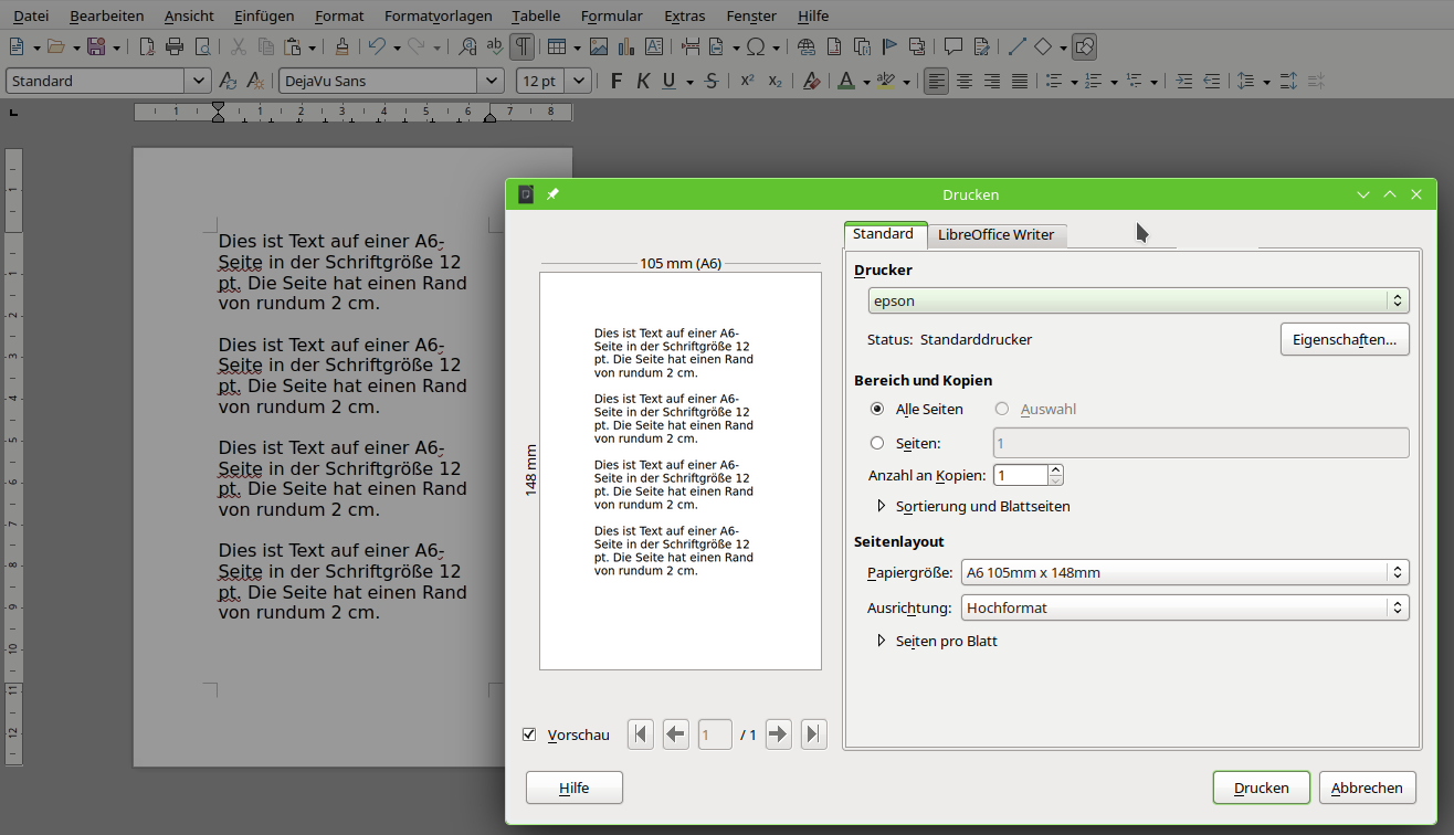 Die Seitengröße in Libreoffice ist auf A6 eingestellt. In den Druckereigenschaften ebenfalls A6. In der Druckereinstellung in Libreoffice wird aber A6 immer wieder mit A4 überschrieben.