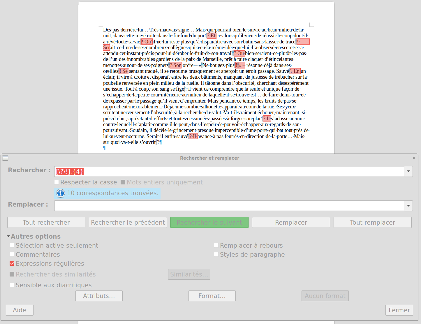 Peut-être faudrait il mettre un écran d’avertissement avant d’utiliser un caractère de ce type en cochant “Expressions régulières” car sans sauvegarde ce bug est potentiellement agressif et devastateur (perte de la totalité des données)