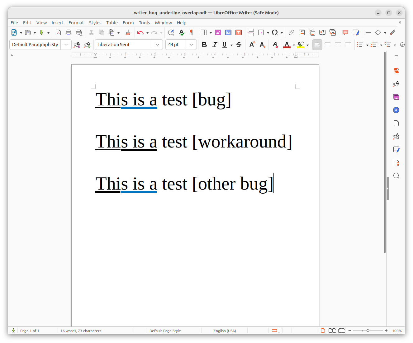 I recently noticed a bug in LibreOffice Writer : when two different types of underline (e.g. single, double, bold, dotted, dash, etc.) overlap, the second underline will not use the same color as the text.