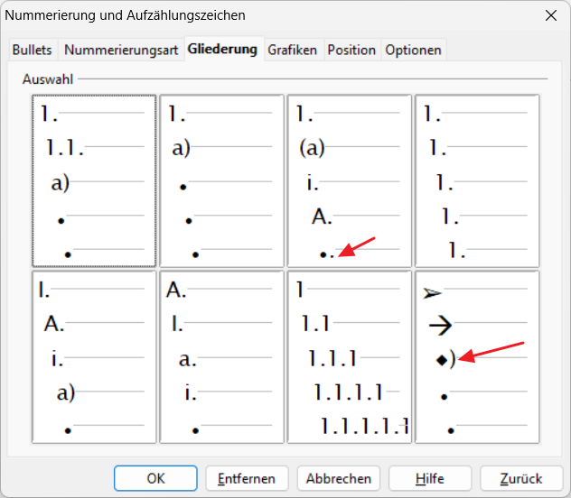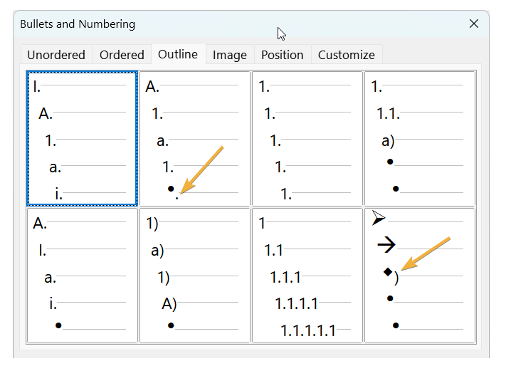 Open the Bullets and Numbering dialog and select the Outline tab. Look at the preview of the two outline formats: