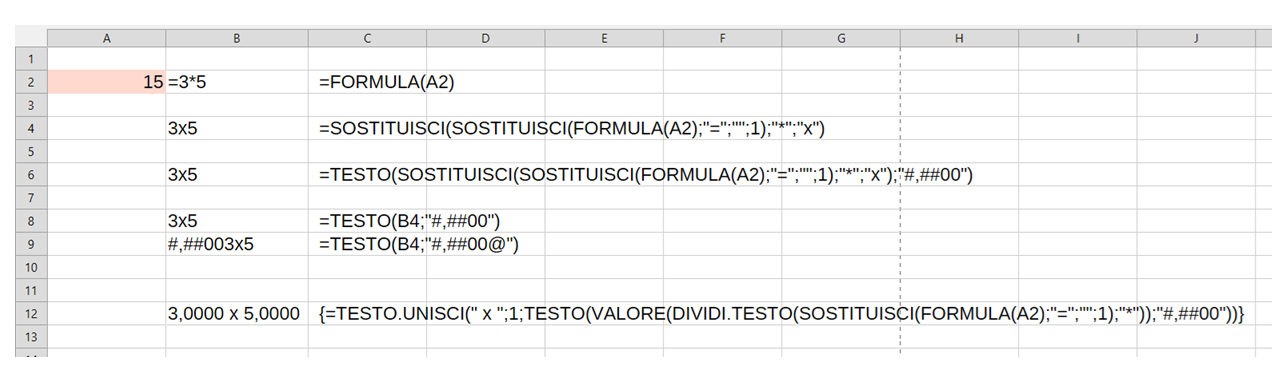 Le soluzioni funzionano correttamente, ma resta un elemento che credo sia difficile da aggirare: nella cella di calcolo scrivo “3,00 x 5,00” e nella cella di inserimento della formula viene restituito “3 x 5”, in quanto vengono rimossi gli zeri dopo la virgola. Ho provato a scrivere la formula nidificata in una formula TESTO con la relativa impostazione del formato, ma non cambia…