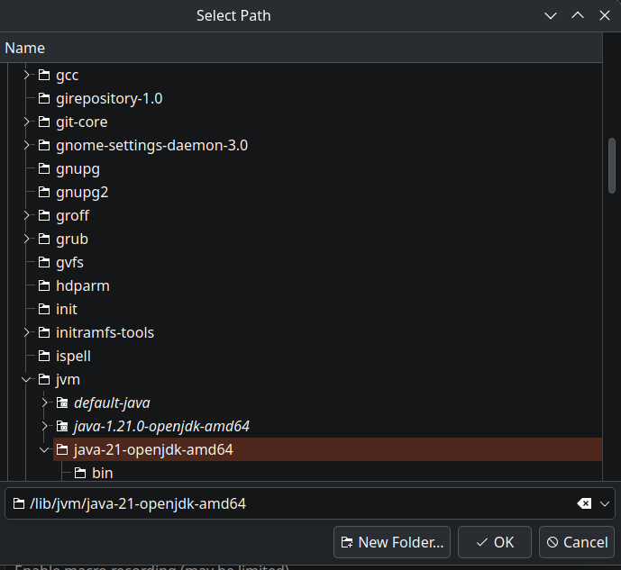 Trying to add /lib/jvm/java-21-openjdk-amd64, and pushing ‘OK’, does nothing. The dialog box keeps reopening.
