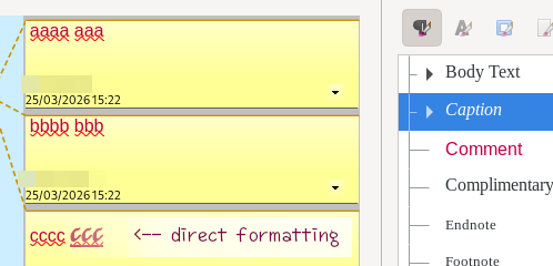 Vous modifiez le style du paragraphe « Commentaire », et tous les commentaires (qui ne bénéficient pas d’une mise en forme directe, comme le dernier « ccc ») recevront les options de style.