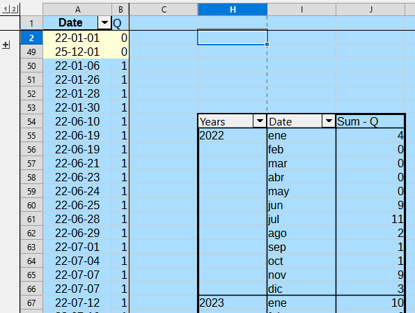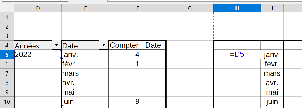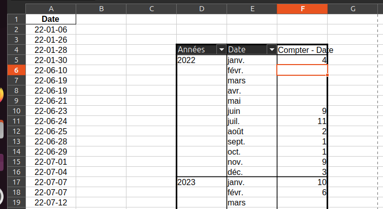 Dans une table dynamique, qui a pour source une série de dates, j’ai mis les dates groupées par mois dans le champ des lignes, et dans le champ des données j’ai mis “compter le nombre de dates”.