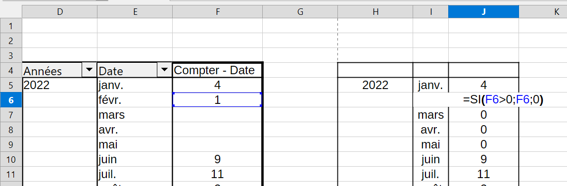 Le problème c’est du coup dans le champ “compter le nombre de dates”, il n’y donc rien à compter pour ces mois vides, et donc il ne m’affiche rien. Comment faire pour afficher des 0s au lieu de cellules vides ?
