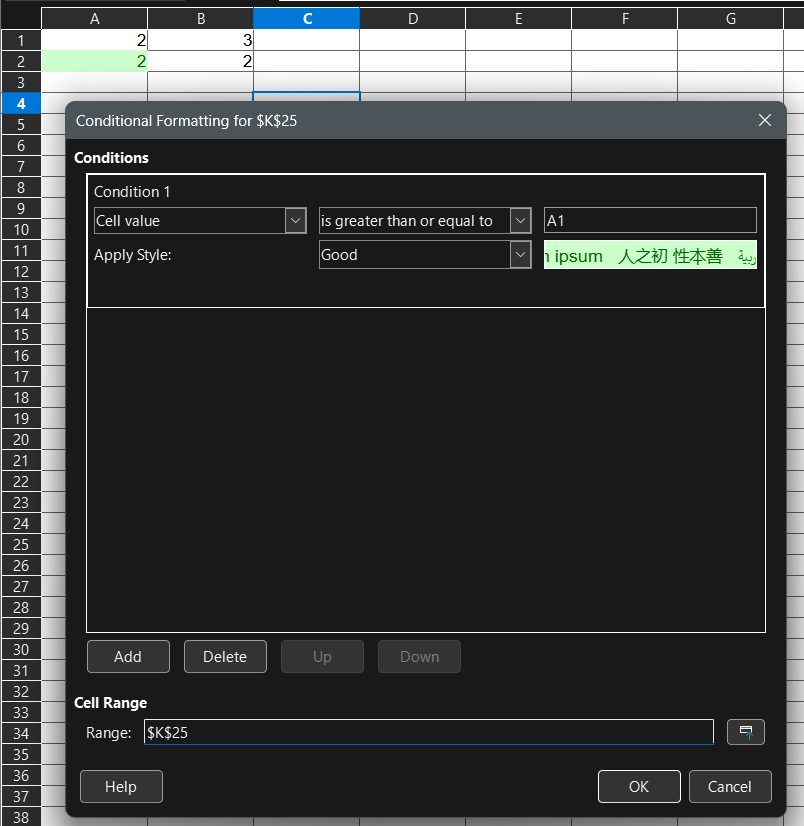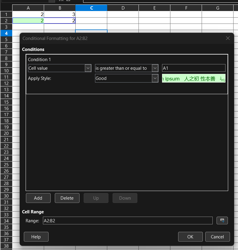 As you see in the cond. form. manager after simply copy and paste in the ‘Range’ field it appears the group A2:B2 which it should be only B2 and in the ‘Condition 1’ field it remains A1 which should be instead B1