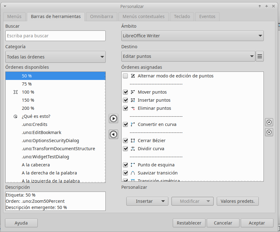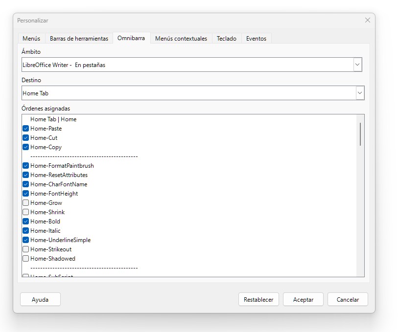 No soy capaz de encontrar exactamente las rutas que me describes. A donde alcanzo a llegar es a este cuadro donde sí que parecen estar todas las opciones disponibles pero (aparte de que no está en castellano y no entiendo por qué ya que he visto ejemplos en internet donde esa misma ventana está traducida) los elementos que yo quisiera tener disponibles en la pestaña ya están marcados, pero no aparecen en la pestaña ya que deduzco que no estoy en el sitio correcto, ya que el número de comandos que hay aquí es muy largo y las pestañas tienen una capacidad limitada…