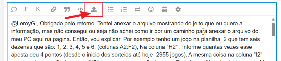 @LeroyG , Obrigado pelo retorno. Tentei anexar o arquivo mostrando do jeito que eu quero a informação, mas não consegui ou seja não achei como ir por um caminho para anexar o arquivo do meu PC aqui na pagina. Então, vou explicar. Por exemplo tenho um jogo na planilha_2 que tem seis dezenas que são: 1, 2, 3, 4, 5 e 6. (colunas A2:F2), Na coluna “H2” , informe quantas vezes esse aposta deu 4 pontos (desde o inicio dos sorteios até hoje -2955 jogos). A mesma coisa na coluna “I2” para acertos com 5 números e “J2”, para acertos com 6 números. Tentei essa fórmula abaixo que a IA do Google me passou, mas também não funciona, o resultado sempre retorna “0” =SOMA(SE((‘Banco_de_Dados’.B8:B5000=$B$4)+(‘Banco_de_Dados’.B8:B5000=$C$4)+(‘Banco_de_Dados’.B8:B5000=$D$4)+(‘Banco_de_Dados’.B8:B5000=$E$4)+(‘Banco_de_Dados’.B8:B5000=$F$4)+(‘Banco_de_Dados’.B8:B5000=$G$4)+(‘Banco_de_Dados’.C8:C5000=$B$4)+(‘Banco_de_Dados’.C8:C5000=$C$4)+(‘Banco_de_Dados’.C8:C5000=$D$4)+(‘Banco_de_Dados’.C8:C5000=$E$4)+(‘Banco_de_Dados’.C8:C5000=$F$4)+(‘Banco_de_Dados’.C8:C5000=$G$4)+(‘Banco_de_Dados’.D8:D5000=$B$4)+(‘Banco_de_Dados’.D8:D5000=$C$4)+(‘Banco_de_Dados’.D8:D5000=$D$4)+(‘Banco_de_Dados’.D8:D5000=$E$4)+(‘Banco_de_Dados’.D8:D5000=$F$4)+(‘Banco_de_Dados’.D8:D5000=$G$4)+(‘Banco_de_Dados’.E8:E5000=$B$4)+(‘Banco_de_Dados’.E8:E5000=$C$4)+(‘Banco_de_Dados’.E8:E5000=$D$4)+(‘Banco_de_Dados’.E8:E5000=$E$4)+(‘Banco_de_Dados’.E8:E5000=$F$4)+(‘Banco_de_Dados’.E8:E5000=$G$4)+(‘Banco_de_Dados’.F8:F5000=$B$4)+(‘Banco_de_Dados’.F8:F5000=$C$4)+(‘Banco_de_Dados’.F8:F5000=$D$4)+(‘Banco_de_Dados’.F8:F5000=$E$4)+(‘Banco_de_Dados’.F8:F5000=$F$4)+(‘Banco_de_Dados’.F8:F5000=$G$4)+(‘Banco_de_Dados’.G8:G5000=$B$4)+(‘Banco_de_Dados’.G8:G5000=$C$4)+(‘Banco_de_Dados’.G8:G5000=$D$4)+(‘Banco_de_Dados’.G8:G5000=$E$4)+(‘Banco_de_Dados’.G8:G5000=$F$4)+(‘Banco_de_Dados’.G8:G5000=$G$4))=4))
