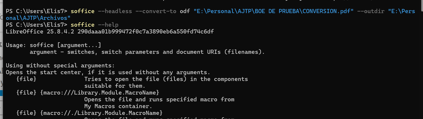soffice --headless --convert-to odf "E:\Personal\AJTP\BOE DE PRUEBA\CONVERSION.pdf" --outdir "E:\Personal\AJTP\Archivos"