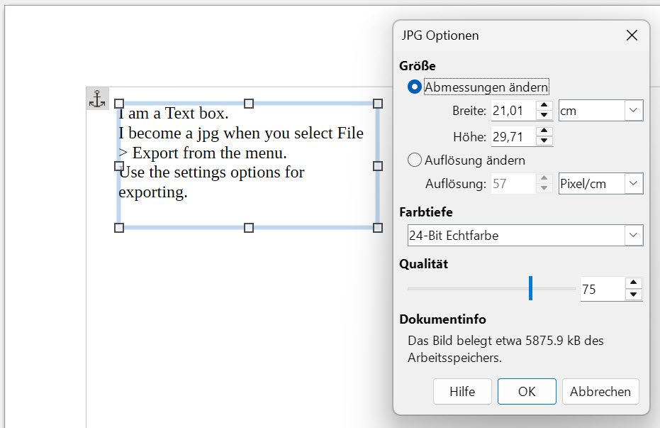 When converting a text box with just text in it to a .jpg or .png image it works EXCEPT it appears blurry; not as crisp as when printing from Writer or Draw. I use frames/text boxes occasionally with an image AND text, convert entire frame to an image but, again, the text is blurred a bit. If I print directly from Writer or Draw without converting the box to an image, it is fine. Need to convert however for some of the ways it is being used. Any ideas? I looked online and could not find any positive information on converting a text box to .jpg.