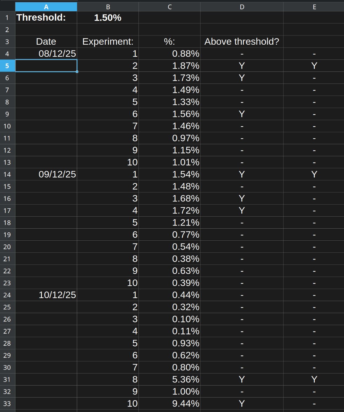 - =IF() function evaluates if experiment reached threshold or not. Outcomes are in column D.
