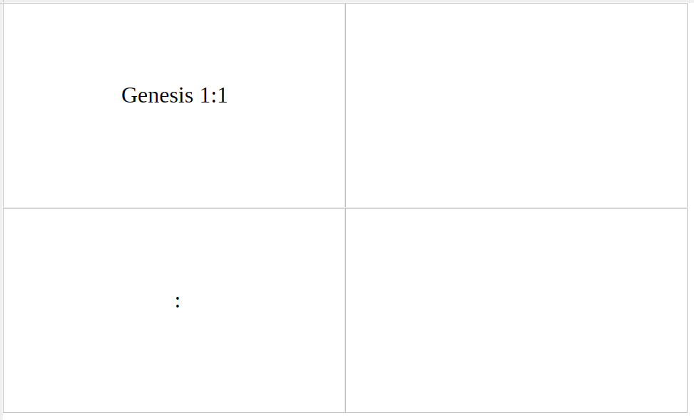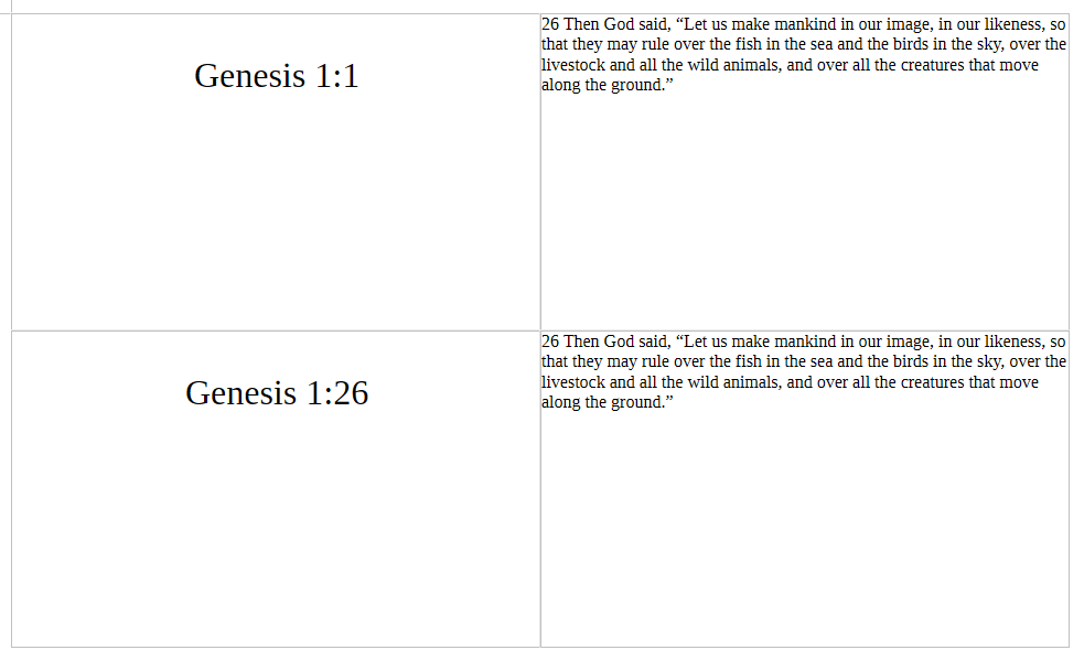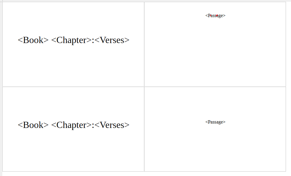 I am creating some labels for LibreOffice (uninstalled Microsoft yesterday - fed up). I want to have it load pages with two references on one column and two passages on the second column. It looks like it works but all I get is the first value in column 1 row 1 of each page.