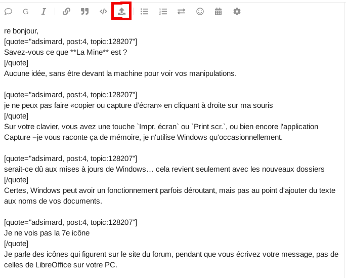Quand vous dites télécharger vos captures d’écran sur le forum, utilisez la 7e icône. ?? j’aimerais bien vous en faire une copie de la page qui s’ajoute mais je ne peux pas faire «copier ou capture d’écran» en cliquant à droite sur ma souris rien n’arrive sur cette page seulement, mais sur une autre page je peux tout faire … Je ne vois pas la 7e icône …