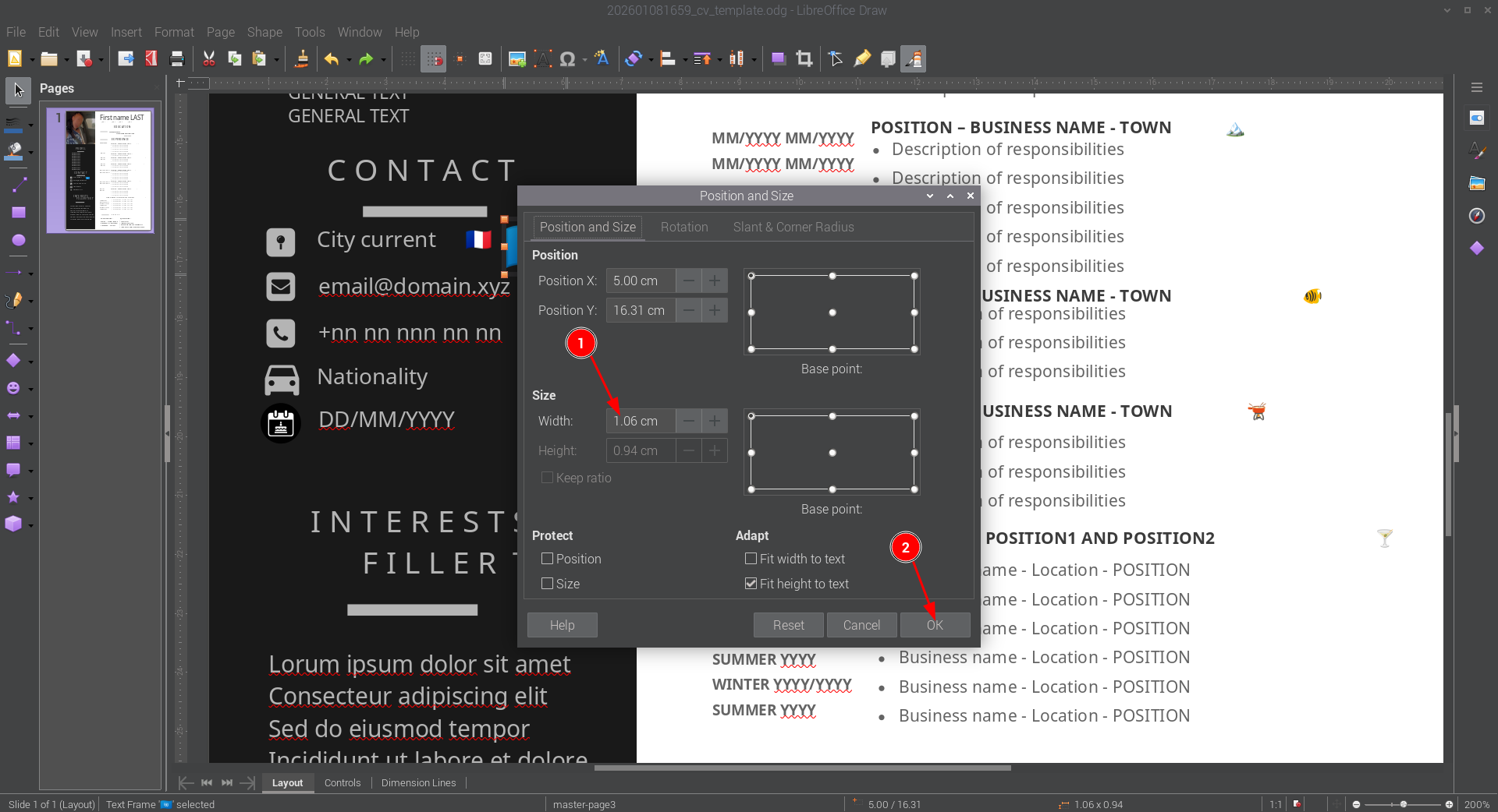 Globally speaking, your document does not use styles. Draw styles are less user-friendly than Writer ones but their use would be beneficial to you because your text boxes can be grouped into "categories (headings, sub-headings, description, annotation, …). Styling them would allow to reformat the document centrally, without doing it on every text box.