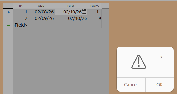 If I set Dep = Evt.Source difference in days is inserted in the control, but table does not update (of course I think).