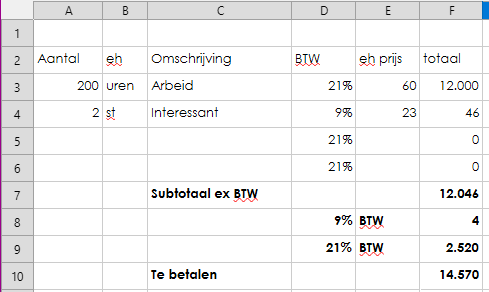 Ben al volop aan het werk met Calc, veel sjablonen konden zonder pijn worden overgezet. Nu ben ik bezig met mijn factuursjabloon. Het briefhoofd is klaar, nu ben ik bezig met de factuurregels en de optelsom inclusief BTW. Dat lukt aardig, ik loop vast op het optellen van de bedragen specifiek voor 9% BTW en de bedragen voor 21% BTW. In Excel gebruikte ik daarvoor: =SOM.ALS(I5:I32;9%;J5:J32) in het geval van 9% BTW.