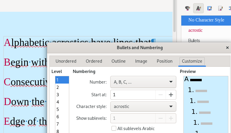 I’m writing (or rather, translating) some poetic verse which is alphabetic acrostic, and wanting mild highlighting of the first letter, thus: