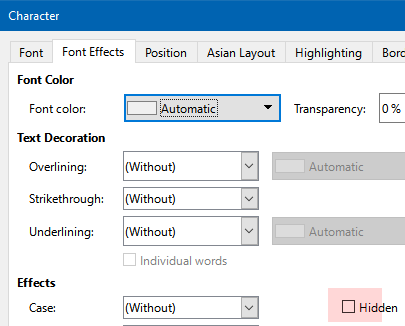 in Font>Effects, set Font color to white (or the colour of your final document background)