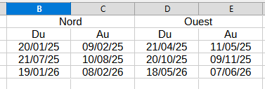 Je ne trouve pas de formule de formatage conditionnel qui couvre une période de date. J’ai celle pour un jour (comme jours fériés)