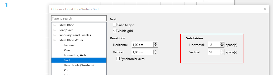Tools > Options > LibreOffice Writer > Grid > Visible grid is checked.