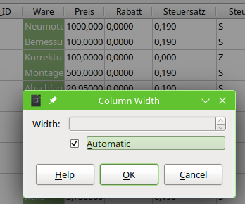 @RokeJulianLockhart : Don’t know which version of LibreOffice you use, but here the automatic width is set by default. Note: Automatic width will only be the automatic width for the column header, not for the content. It will look like this: