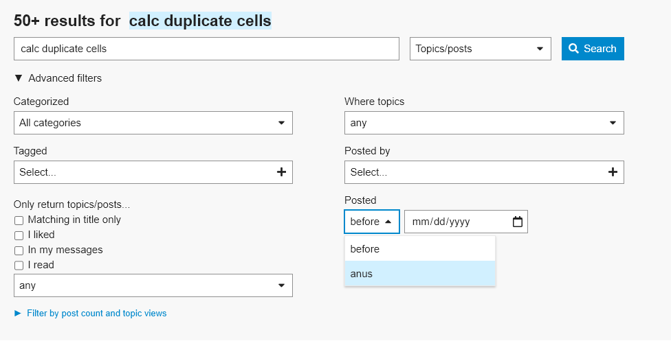 Also, when I was looking for answers to this question, I wanted to find answers that were no older than a few years old. I went to advanced search functions, and under date I could select either before or anus. Not a joke! And it wouldn’t let me select anus. I took a screen shot (see attached).