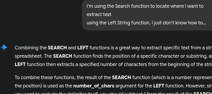I’m using the Search function to locate where I want to extract text using the Left String function, I just don’t know how to combine the two functions. For example within one row of data there’s text with multiple delimiters within the string. Search finds the second delimiter correctly. Now I want to grab the text that precedes the delimiter.