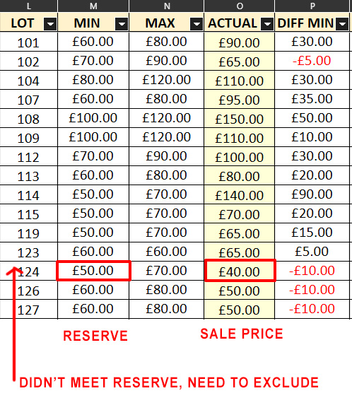I thought I could use the difference column (DIFF MIN) to show which lot missed the minimum estimate as a negative and then use that negative to remove the corresponding lot bid (ACTUAL) from the total of that column but I’m stumped as to how to do this, can anyone offer some advice please?