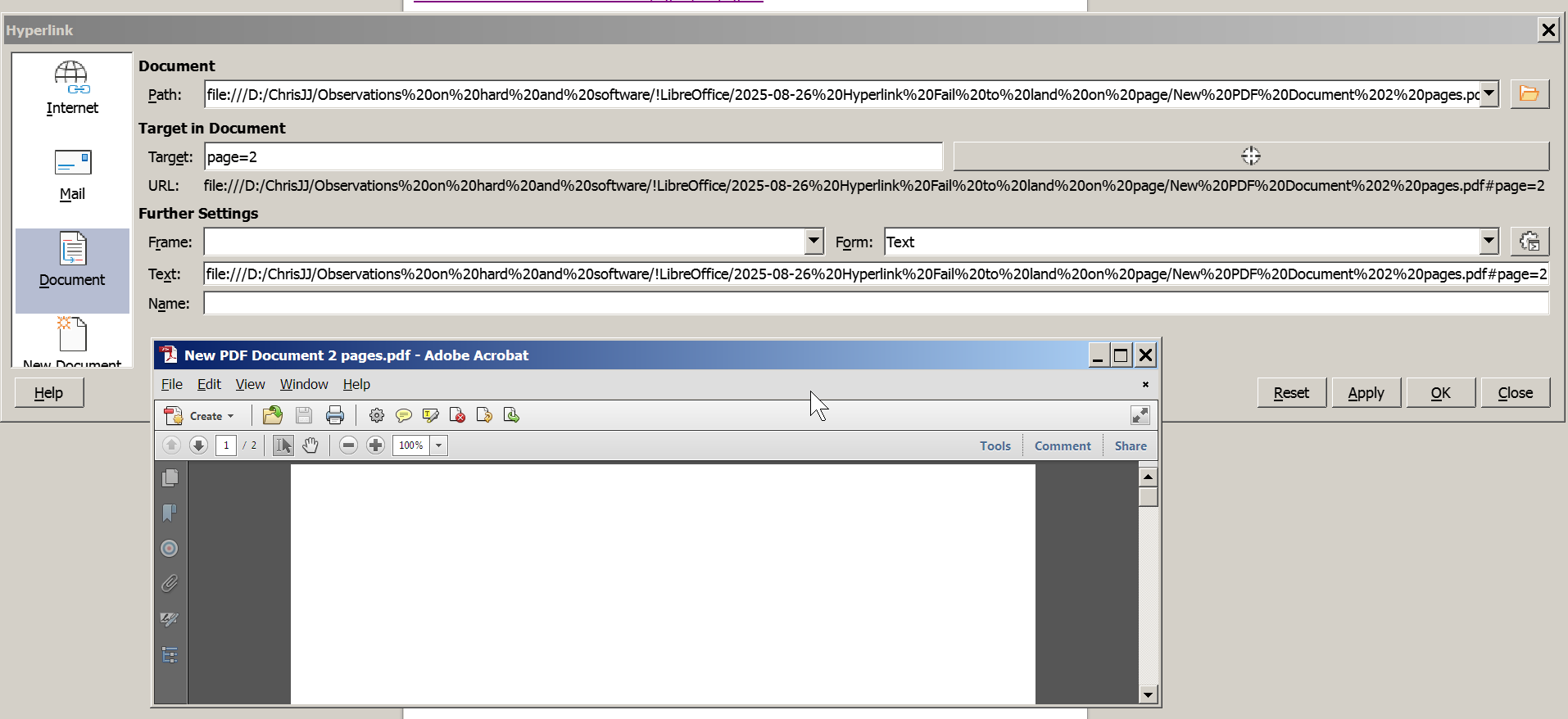 The Target button fails to offer pages, except under Slides ( despite that there are no Slides in the PDF ) and picking one there has zero effect on the landing.