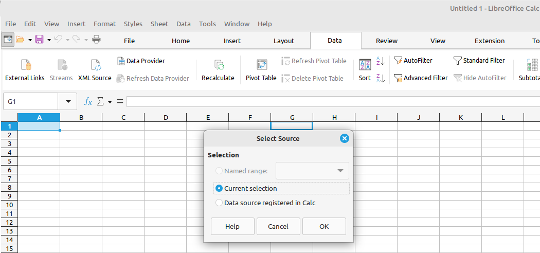 In LibreCalc when you try to insert a Pivot Table you get a Select Source pop-up that gives you three options: