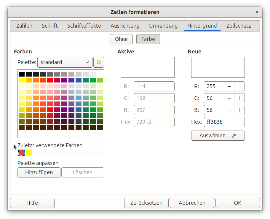 Zur Störung noch das: Es lassen sich die Zellen farblich formatieren, die Farben stellen sich auf dem Bildschirm allerdings nicht dar, wenn ich ein PDF mache sind sie aber zu sehen. Hier noch ein Screenshot von dem Eingabefenster zur Zellformatierung, in dem die Farben (hier war rot ausgewählt) auch nicht dargestellt sind, aber dann trotzdem die Zelle entsprechend formatiert wird.