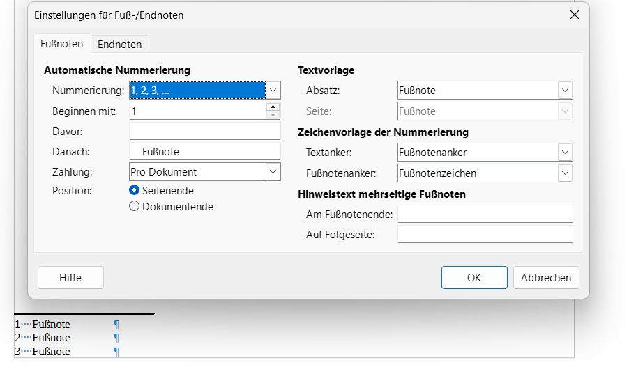 In meinen Fußnoten sind Erläuterungen sehr ausführlich und oft über mehrere Zeilen fließend. Für ein übersichtliches Layout setze ich den Fließtext semi-flüssig manuell mit Zeilenvorschub und Tabulator-Abstand an die schöne Stelle. Diese Prozedur ist sehr aufwändig, sobald ich irgendetwas ändere oder ergänze.