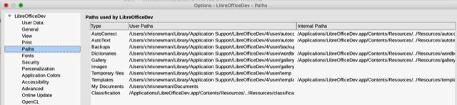 The Paths show you where your user profile is, from what I can make out from your screenshot your profile is the user folder at /Users/chrisâŚ/Library/Application Support/LibreOfficeDev/4/.