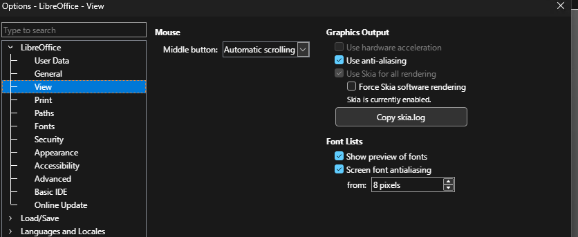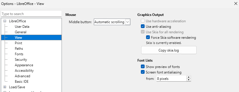 Open LibreOffice, click Tools > Options > LibreOffice > View and tick the box Force Skia software rendering. OK and allow LibreOffice to restart.