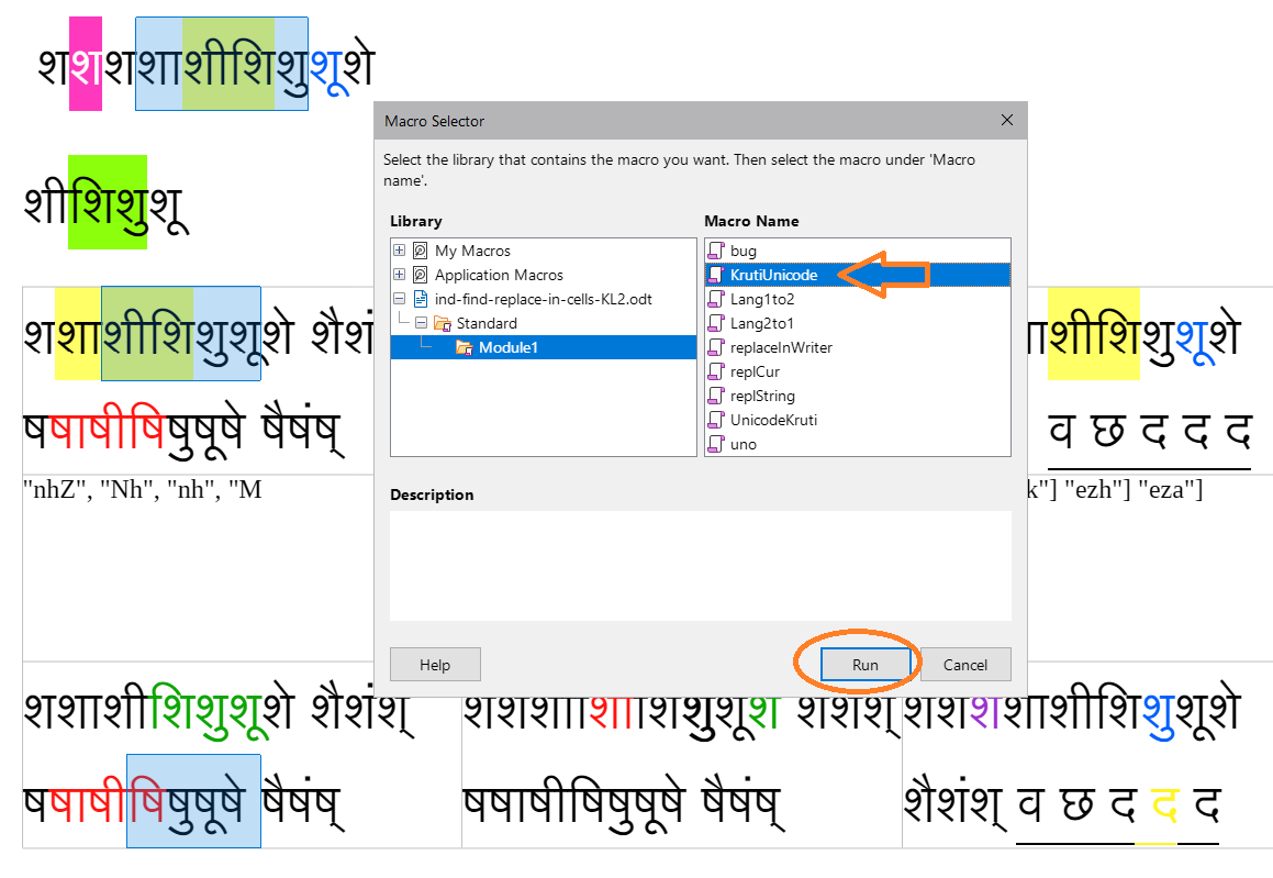 Nowhere. I tried to type some kruti dev and some unicode text in your document. Then select it and try to run macro but it is not converting. I tried it in cells and also tried it in outside the text. After opening your document it is showing error "Please install the hyphenation package for locale “hi-IN”. Does it has something to do with the functioning of the macro.
