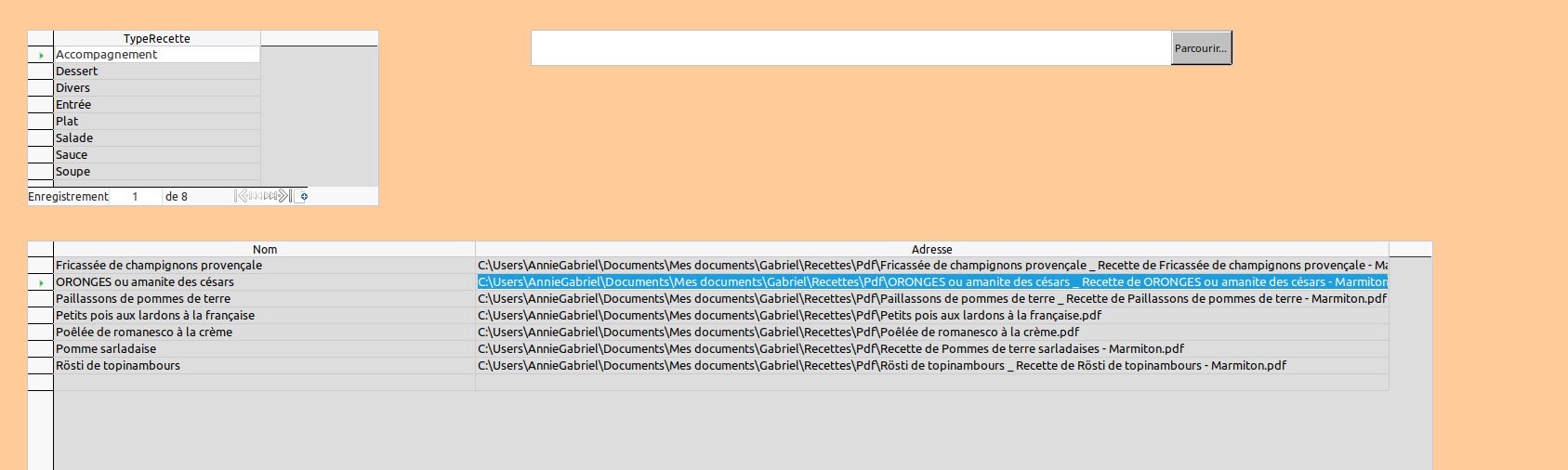 Ex : C:\Users\AnnieGabriel\Documents\Mes documents\Gabriel\Recettes\Pdf\ORONGES ou amanite des césars _ Recette de ORONGES ou amanite des césars - Marmiton.pdf