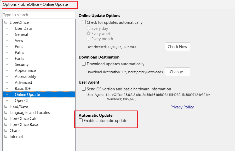 Outils - Options - LibreOffice - Mise à jour en ligne