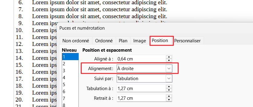 Lorsque je crée une liste ordonnée dans Writer, avec le style prédéfini “Numérotation 1”, les numéros de lignes sont alignés verticalement à gauche sur le premier chiffre. Comment peut on aligner les numéros de lignes sur le séparateur situé après ce numéro. Par exemple si je numérote les lignes 1), 2), 3) etc, comment aligner les numéros de lignes sur la parenthèse.