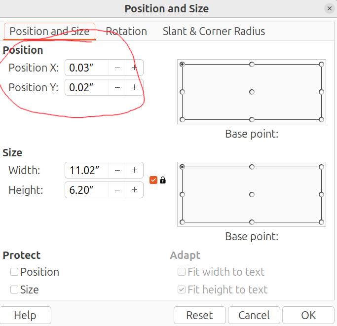 I have an Impress slideshow that consists entirely of JPEGs that fill each slide. The slides are set to 16:9 and each JPEG is 1600x900px. However, when I paste the JPEG into the slide, it is always offset by 0.03,0.02" and I have to go into “Position and Size” and set those values to 0,0. Is this a bug? Is it a setting?