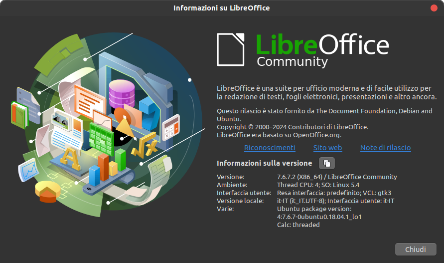 Il tuo primo screenshot (Informazioni sulla versione) mostra il numero di versione di LibreOffice: 7.6.7.2