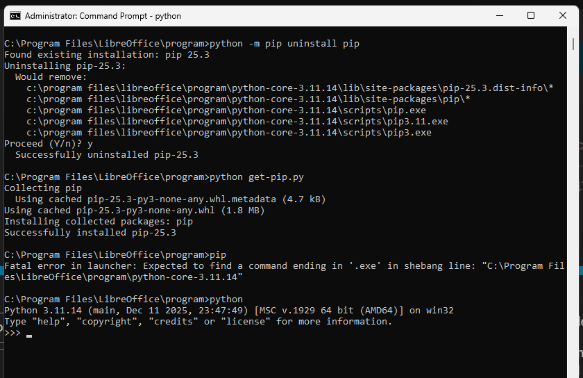 I am trying to install pip into my libreoffice python install, and it seems to be installing it, but I’m getting an odd message right after I install it: