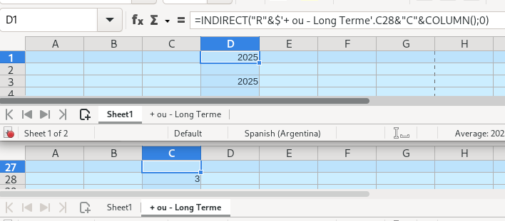 =INDIRECT(“E”&’+ ou - Long Terme’.$C28 (’+ ou - Long Terme’.$C28 étant la cellule ou je récupère le No de ligne vous l’avez compris)
