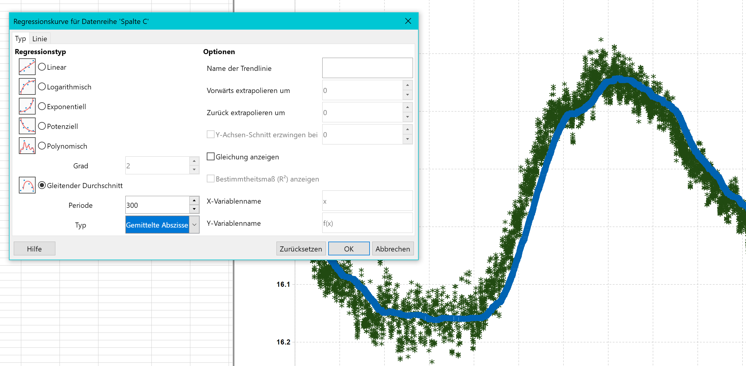 ich habe ein massives Problem bei Ausgabe von Graphen, bei denen eine Trendlinie (gleitender Durchschnitt, gemittelte Abszisse) erzeugt wird.