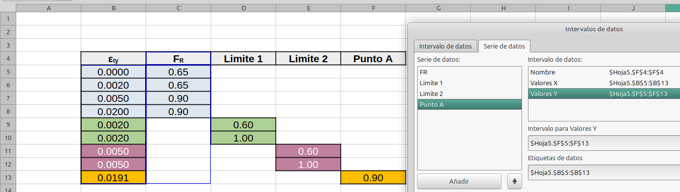 Una segunda solución que ensayé mas recientemente fue hacer una sola gráfica poniendo todos los valores de “X” en una columna y acomodando los valores de “Y” en columnas diferentes, una columna por cada serie. Esto tambien me funcionó pero NO debe estar seleccionado “Ordenar por valores de X” en la ventana “Tipo de gráfico”, y para cada serie seleccionar todas las filas: como se ve en la imagen